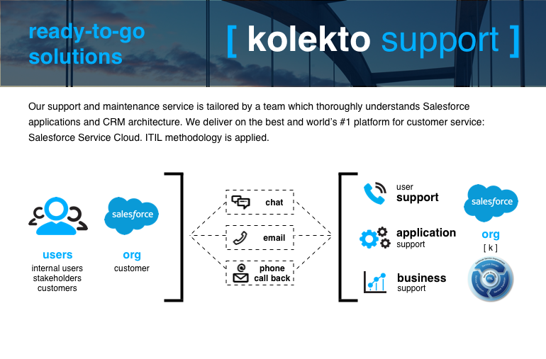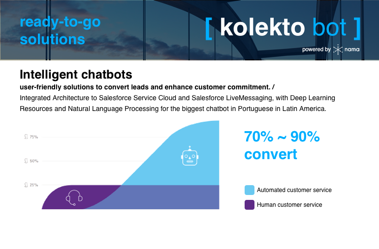 Highlights We were founded in 2012 with the purpose of - through technology - reducing the distance between the established objectives and the results achieved by our customers. We develop solutions with an emphasis on leads management, sales automation, customer service and support, mobile applications and portals, as well as the creation and automation of 1:1 customer journeys through multi-channels. Since 2014 we became strategic partners of Salesforce in Brazil with an outstanding performance in the Manufacturing segment. We achieved quickly a level of excellence and recognition in this ecosystem through local, regional and global projects. Description In addition of consulting, development of mobile application and cloud computing portals and deployment of customized solutions in digital marketing, we have a complete portfolio of ready-to-go services and products to quickly insert your company in the best practices of the CRM world:[ kolekto oem ] [ kolekto leads ] [ kolekto dealer ][ kolekto support ] [ kolekto bot ] [ kolekto hackforce ]